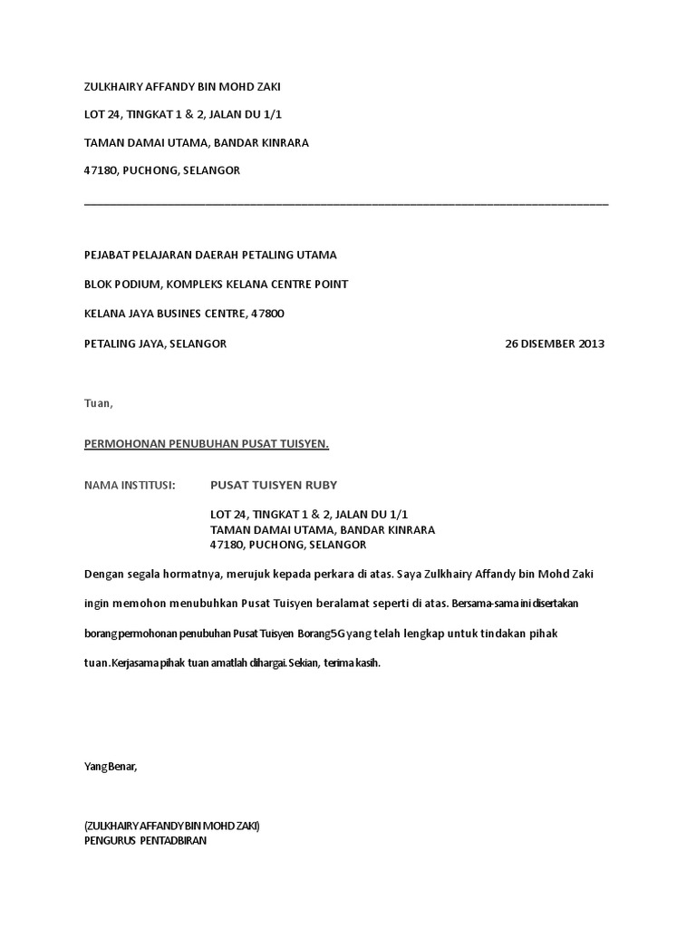 Contoh Surat Kelas Tuisyen