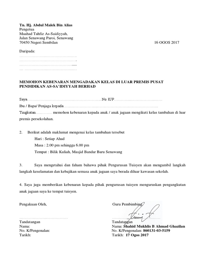 Contoh Surat Makluman Kelas Tambahan Linus Pdf